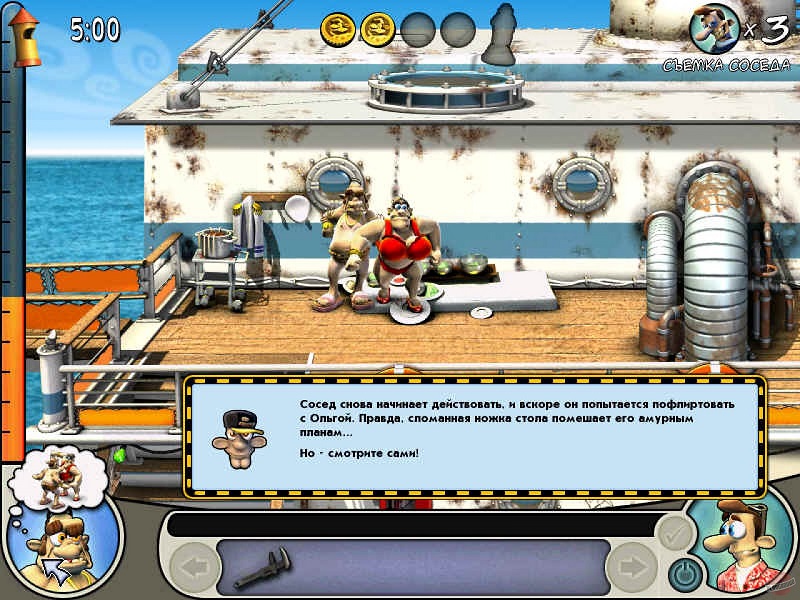 Начинать прохождение нового эпизода лучше всего со сбора нужных предметов. Они потребуются для того, чтобы подстроить пакости соседу. Шкала бешенства соседа имеет свойство снижаться, так что все ловушки лучше подставить так, чтобы они шли одна за другой. Чтобы сделать так, нужны сразу все предметы, это поможет сэкономить время. Каждая такая «шутка» добавит вам проценты прохождения миссии, если шкала злости не успеет уменьшиться от предыдущей ловушки, то процент будет максимальным. Чем больше вы наберете процентов прохождения, тем лучше медаль получите за эпизод.