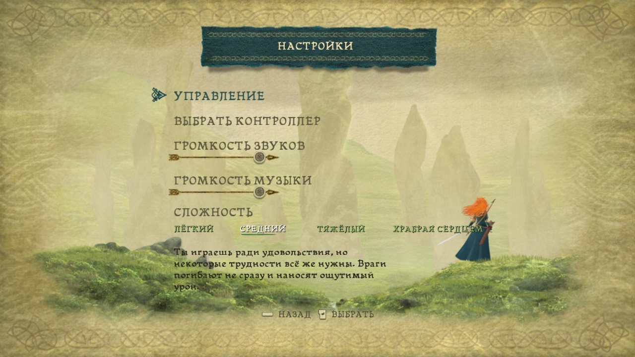 Стилистика игры заметная еще в главном меню. Все его элементы размещены на фоне красивого арта из игры. Выглядит все очень атмосферно и лаконично. Пункты меню всплывают на пожелтевшем листке бумаги с характерным орнаментом. Приятно удивляет то, что в игре есть четыре уровня сложности, а именно: легкий, средний, тяжелый и «храбрая сердцем». Каждый из них отличается друг от друга как живучестью врагов, так и наносимым уроном по ним же. Очень удачно продуман самый сложный уровень, он позволяет даже старшему игроку проходить игру с особым интересом. Также перед началом прохождения вам на выбор будут даны два набора одежды, один из них стандартное одеяние принцессы, второй – кольчуга стражи. Вы можете выбрать что вам захочется в самом начале.