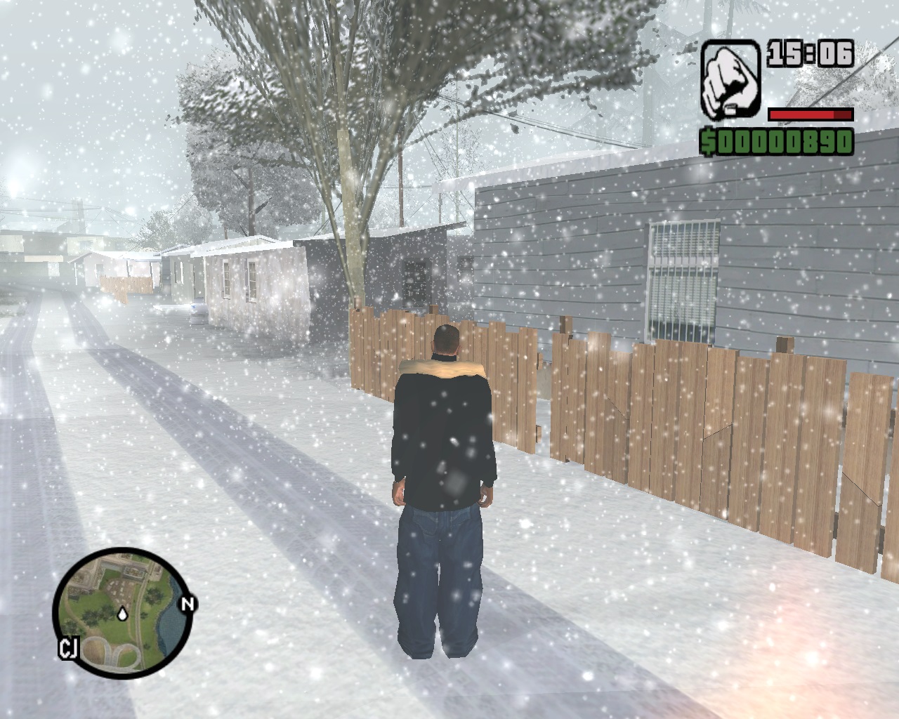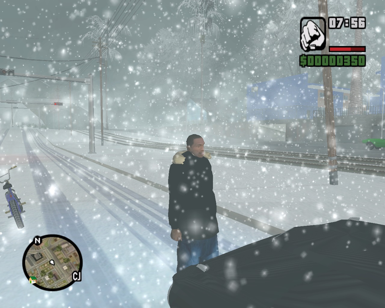 Вместе со снегом в ранее солнечный и жаркий Сан Андреас перекочевала и зимняя одежда, теперь главный герой одет в теплую куртку, которая подбита мехом. Пешеходы вокруг также переоделись по погодным условиям. Также вы можете выбрать погоду, например, можно поставить метель, в таком случае вокруг вас будет хлопьями падать снег. Очень атмосферно получается, правда звуки в игре оставили стандартными, не понятно почему, но это так. То же радио совсем не изменилось, те же станции, те же песни.