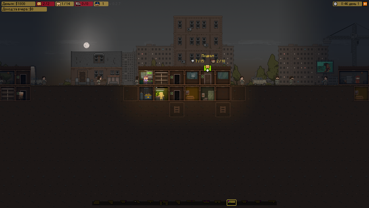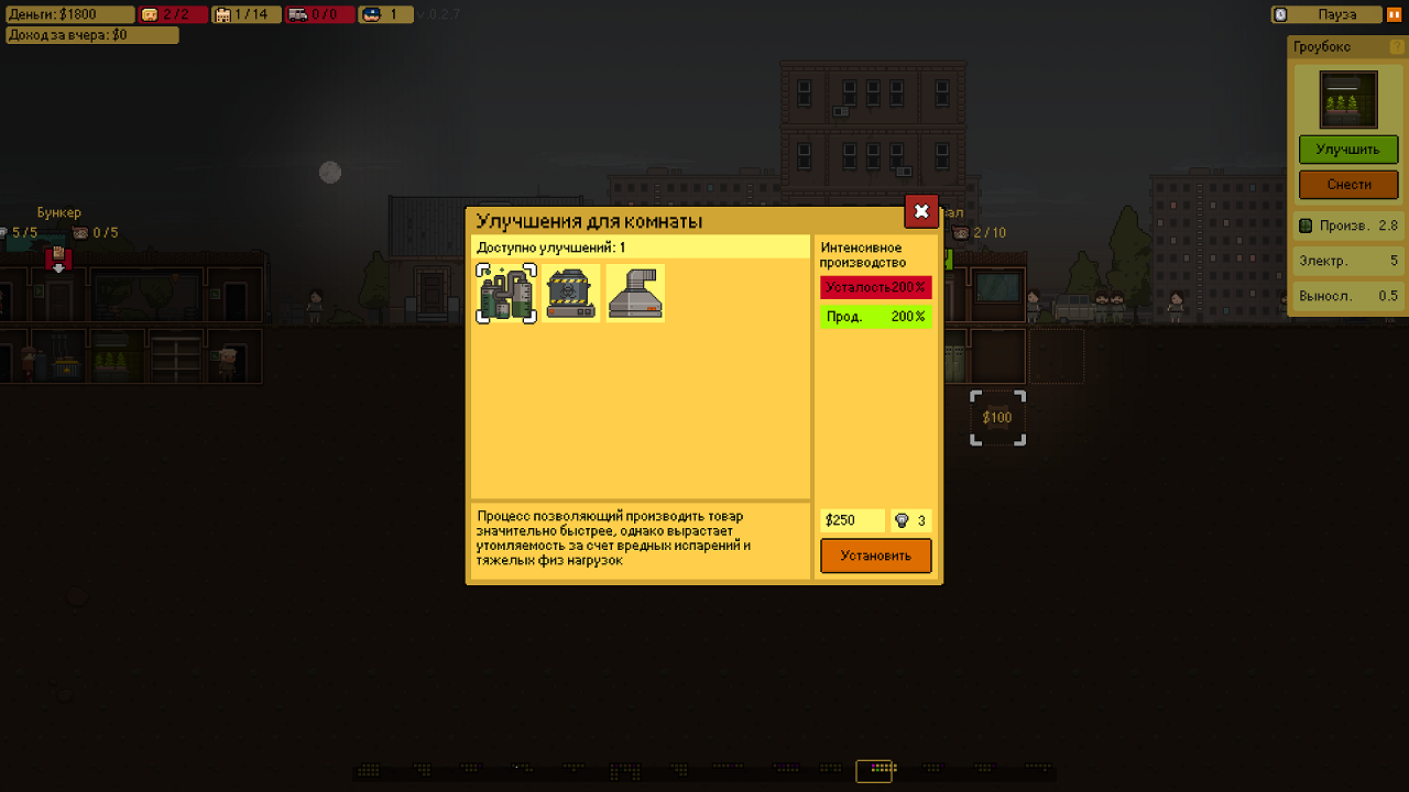 Графика выполнена в стиле пиксель арта, действия все наблюдаются как бы со стороны, в разрезе. Все иконки, истории, персонажи и отделения лаборатории выстроены из небольших пикселей. Такой оформление создано для того, чтобы передать атмосферу игры, мы видели такое в подобных проектах, но еще ни разу никто не додумывался сделать все это под землей. Что касается комнат, то их можно улучить и расширить ровно два раза, при наличии необходимых финансов, конечно. В игре есть 4 типа товара, постепенно все это будет расширяться, но пока что мы может производить 4 вида различных видов наркотиков.
