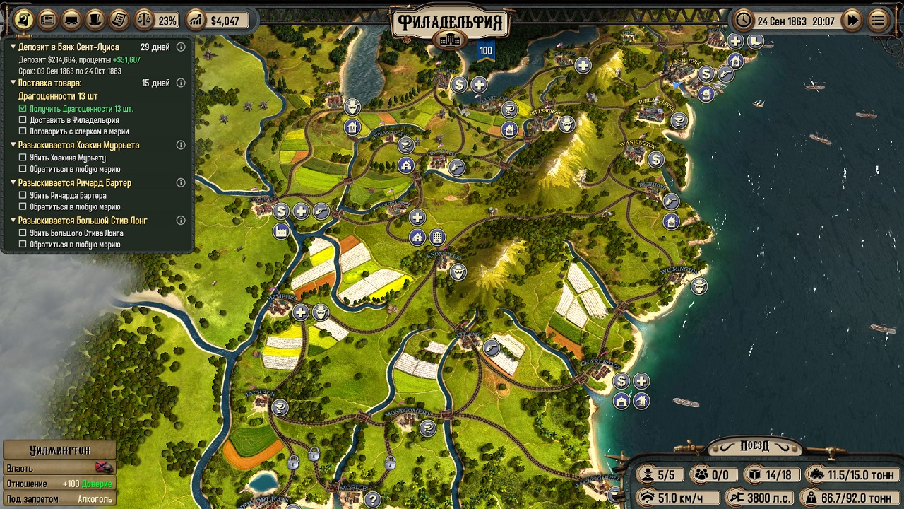 Движение по железной дороге возможно, только если у вас есть лицензия, изначально вашей лицензии хватит на езду между двумя городами. Позже можно приобрести еще лицензии. Чтобы покупать такие дорогостоящие вещи нужны деньги, чтобы их заработать вам придется торговать и заниматься перевозками. Дело это долгое, но веселое. Итак, вам нужно покупать все новые и новые лицензии, чтобы достигнуть города с сюжетным персонажем. Потом опять заработок и новый сюжетный виток и так далее.