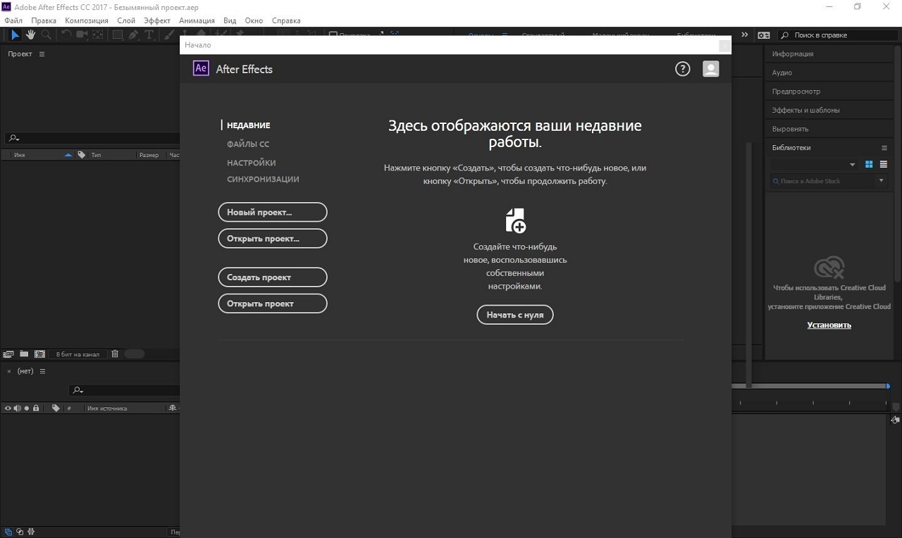 После установки запускаем AE.